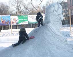 А еще многие с сомнением поглядывают на странную горку, сделанную из фигуры петуха, у которого отвалилась голова, и пытаются разгадать, что это за «неведома зверушка». Думаю, что необязательно нужно затрачивать большие суммы и заказывать искусственный снег, как, например, было сделано в Благовещенске. Только не пойму, неужели нельзя поставить две большие горки, как было раньше, лет десять назад?