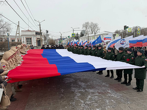 Военнослужащие и юнармейцы развернули большое полотнище российского триколора. Организаторы митинга напомнили, что его длина 15 метров.