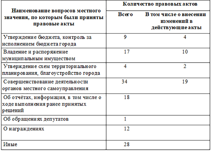 По областям правового регулирования преобладают вопросы в сфере совершенствование деятельности органов местного самоуправления, эффективного управления и распоряжения муниципальной собственностью, значительная часть вопросов посвящена осуществлению контрольных функций, в рамках которых городской Совет активно взаимодействовал с исполнительным органом власти.