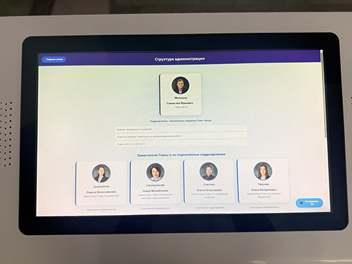 Система установлена в фойе на первом этаже здания и представляет собой сенсорный терминал, сопряжённый большим экраном диагональю 254 см. Разработку по поручению главы Станислава Мелюкова осуществили IT-специалисты управления цифровизации администрации города.