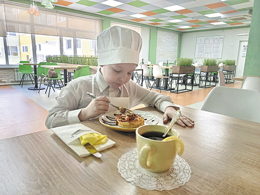 Обед в гимназии состоялся почти под конец рабочего дня, в половину четвёртого. Пока члены жюри раздевались, в школьном кафе переминался с ноги на ногу мальчик Ваня с огромной поварёшкой в руках. Вроде как волновался, но признался - не впервой на публике выступать. Директор гимназии Татьяна Тисличенко тем временем говорила, что блюдо на конкурс - пюре с курицей - выбрали, изучив предпочтения детей. Готовили с душой, а в рецепте пюре нет ничего сложного. Изменили лишь подачу - в виде запечённых корзиночек, внутрь которой и положили куриную начинку. Плюс брусничный соус и два вида хлеба - гречневый и ржаной, и салат из свежих овощей.