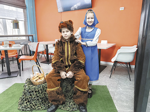 В третьей школе, встречающей членов жюри, школьное кафе стилизовали под известный мультик «Маша и Медведь». Последний сидел в глубине зала, устало опустив плечи, возле корзинки с пирожками.