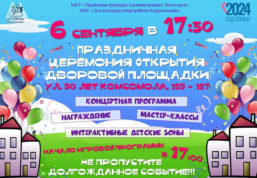 6 сентября в Белогорске состоится открытие новой дворовой площадки по адресу улица 50 лет Комсомола 125-127. Начало праздничной программы запланировано на 17 часов. Организатором мероприятия выступает Дом культуры «Амурсельмаш».