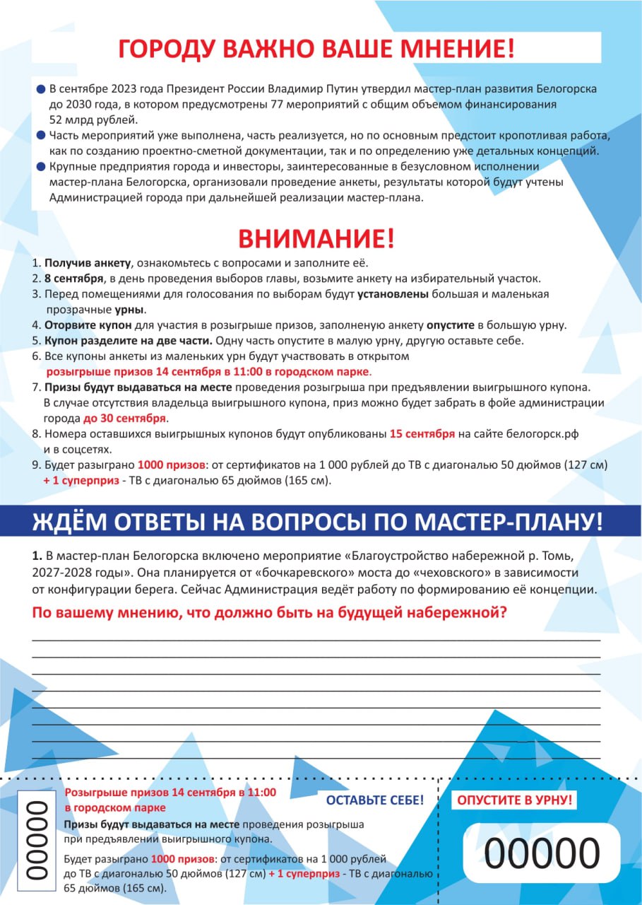Дополнительный 3-тысячный тираж анкет готов, его доставят в Белогорск 4 сентября на избирательные участки. Решение принято организаторами анкетирования общегородского опроса и розыгрыша призов в связи с сообщениями граждан о неполучении анкеты с отрывным купоном.