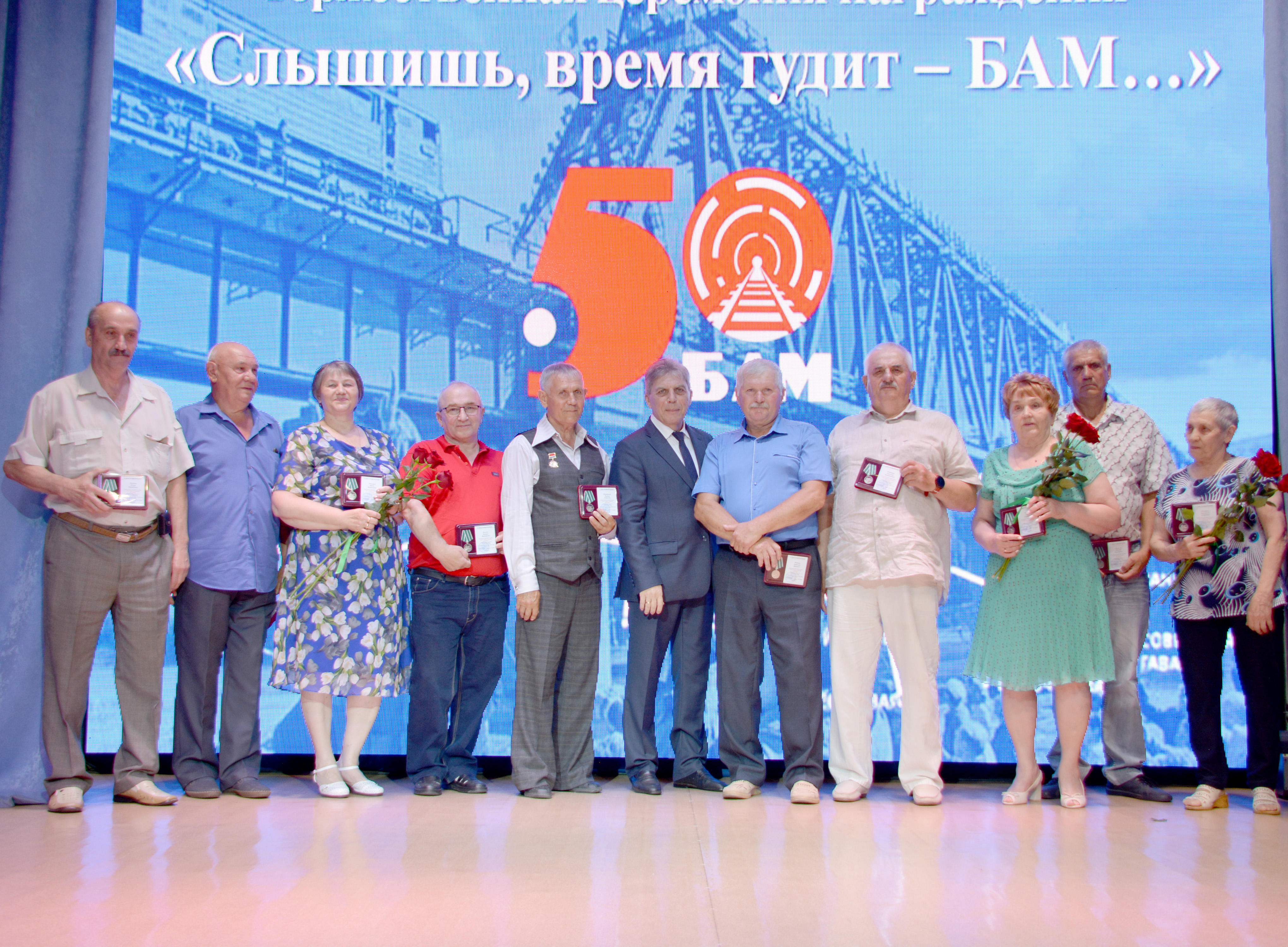 Жителям Белогорска, внёсшим вклад в строительство, реконструкцию, развитие и обслуживание БАМа и её инфраструктуры, вручены федеральные юбилейные медали и памятные знаки Амурской области «50 лет Байкало-Амурской магистрали». Торжественное мероприятие состоялось 5 июля в центре культурного развития. Глава Белогорска Станислав Мелюков и председатель горсовета Виктория Гратий вручили награды 70 жителям Белогорска.