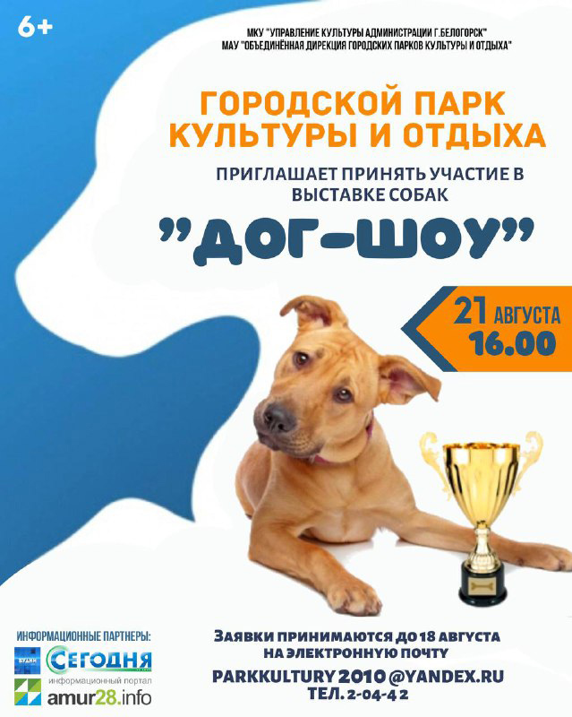 Жителей Белогорска приглашают принять участие в выставке собак «Дог-шоу», которое состоится в городском парке культуры и отдыха 21 августа в 16 часов. К участию в выставке приглашаются общества собаководов и жители города в возрасте от 14 лет и старше, имеющие собак разных пород.
