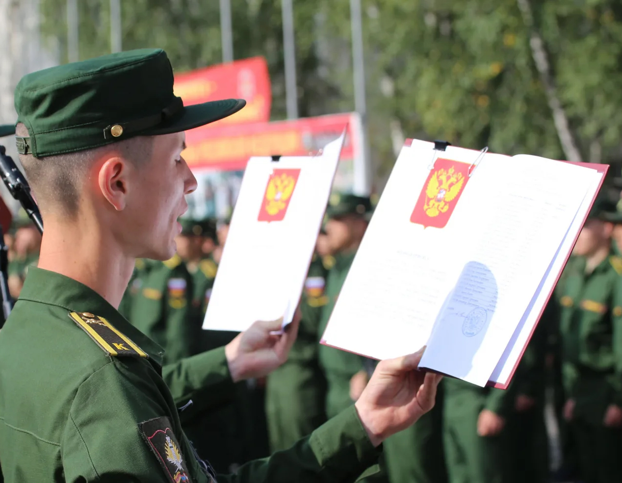 Военная присяга - торжественное обещание, клятва, которую дает гражданин, вступающий в ряды Вооруженных Сил. Принимая присягу, он берет на себя высокие обязательства - "свято соблюдать Конституцию Российской Федерации, строго выполнять требования воинских уставов, приказы командиров и начальников. Клянусь достойно исполнять воинский долг, мужественно защищать свободу, независимость и конституционный строй России, народ и Отечество».