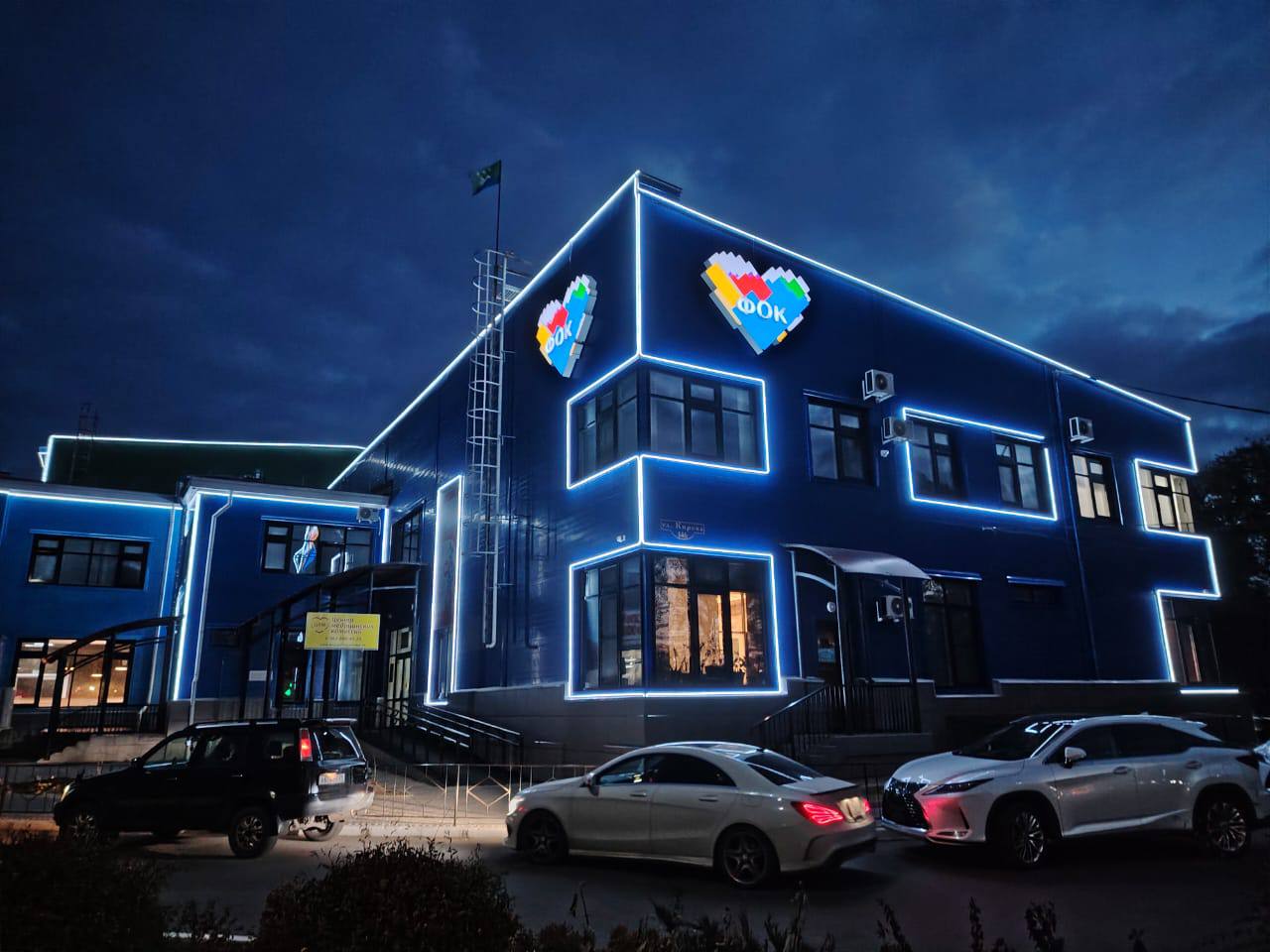 На фасаде физкультурно-оздоровительного комплекса им. С. Солнечникова по поручению главы Белогорска Станислава Мелюкова восстановлена неоновая подсветка.
